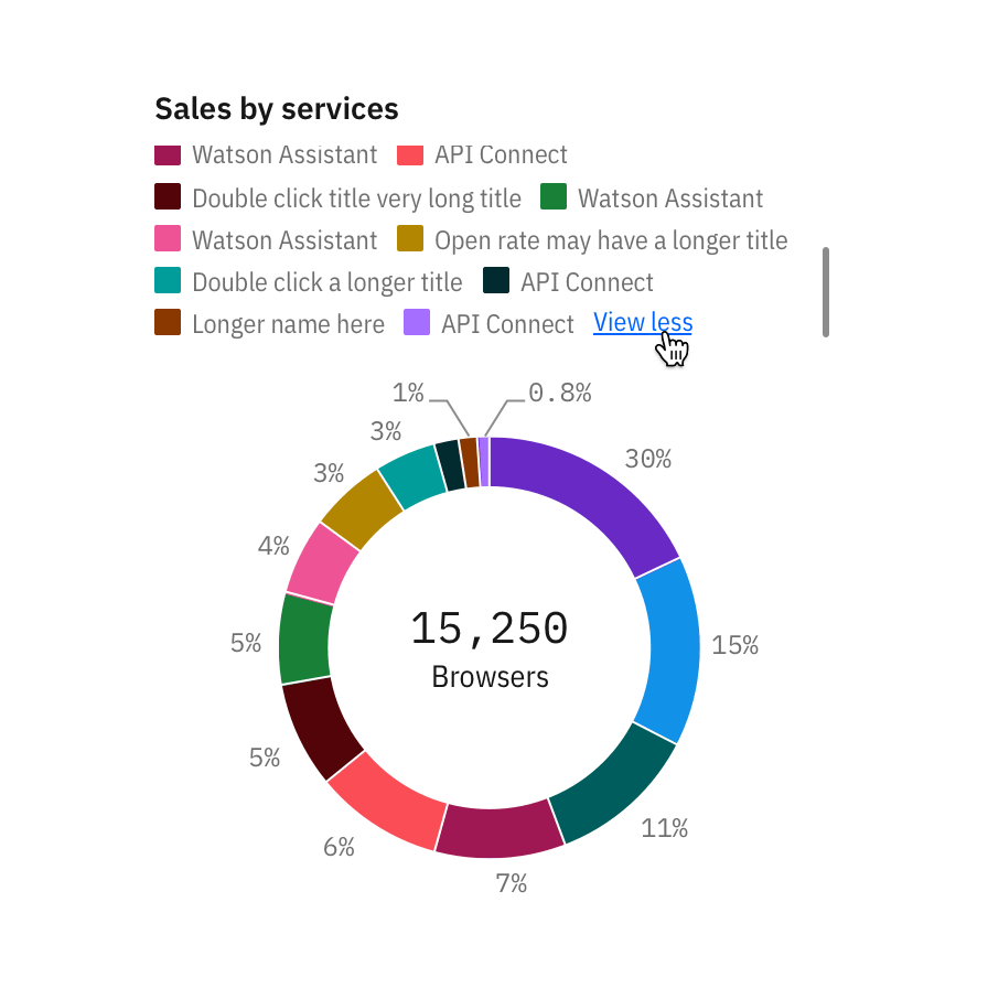 Up to two lines of legends are displayed by default. Clicking on View more expands the legend area to show all legends. A legend should not be taller than 30 percent of the chart’s height.